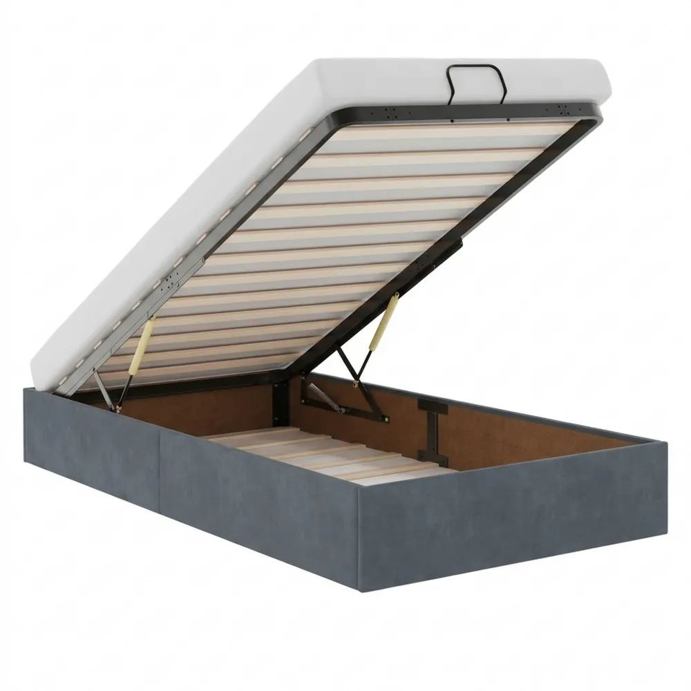 Dieses Ottomanbett bietet eine Kombination aus Funktionalität und Stauraum. Der Samtstoff sorgt für eine angenehme Oberfläche. Unter dem Bett befindet sich ein Stauraum, der Platz für Bettdecken, Kissen und Kleidung bietet. Der hydraulische Hebemechanismus ermöglicht einfachen Zugang zu den gelagerten Gegenständen. Der Lattenrost bietet Unterstützung und Belüftung, es ist kein Boxspringbett erforderlich.