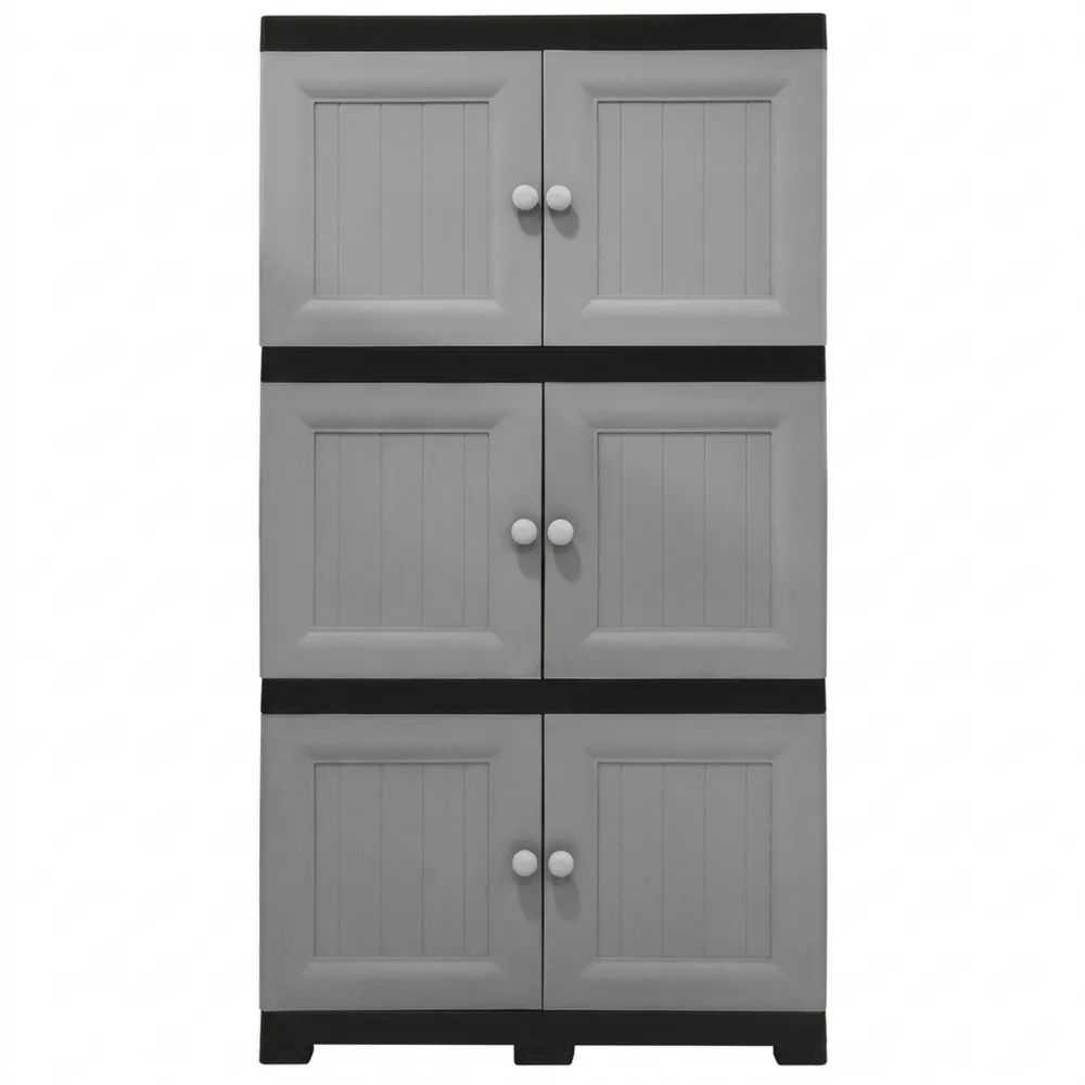 Der Schrank bietet mit Abmessungen von 68 x 48 x 134 cm mehrere Fächer mit einer Kapazität von insgesamt 384L. Die Türen sind mit einem Mechanismus ausgestattet, der ein zuverlässiges Schließen ermöglicht. Hergestellt aus recyceltem Polypropylen, ist das Material wasserabweisend und leicht zu reinigen. Der Aufbau erfolgt durch ein einfaches Stecksystem. Achtung: Maximale Traglast von 20 kg pro Fach berücksichtigen.